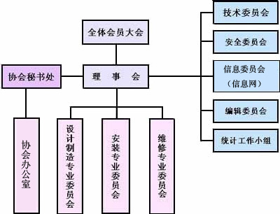 中國電梯協會的最 高權力機構是全體會員大會,大會選舉産生的理事會是協會的領導機構,主要負責讨論、制定協會的工作方針和活動 計劃。協會秘書處負責日常工作。協會辦公室協助理事會、秘書處落實各項工作計劃,做好接待來信、來訪和文件處 理存檔職責,負責社團與政府管理部門的申報、考核、年審、備案等工作,支持各部門的工作有效實施。協會按專業 特點組建了設計制造專業委員會、安裝專業委員會和維修專業委員會等分支機構。此外,協會的技術委員會、安全委 員會、信息委員會(全國電梯信息網)、編輯委員會等是由全行業專家組成的專門機構。